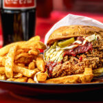Twice-fried chicken sandwiches ($16) are five-napkin affairs. Go for the “Mother-Clucker” with piles of slaw, pickled jalapeños and “Bang Bang” dip made with gochujang, chili crunch and fermented chiles on a brioche bun. It’s fiery and filled with umami but not tongue-singeing.